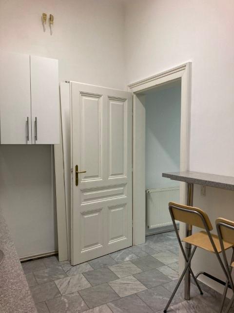 Vorzimmer, 3 große straßenseitige Zimmer miteinander mit Flügeltüren verbunden, 2 hintereinander liegende Kabinette, Küche mit Abstellraum, separate Toilette mit Handwaschbecken